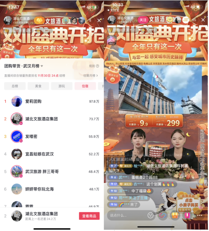 本周熱點(diǎn) 數(shù)旅集團(tuán)聯(lián)手酒店集團(tuán)“雙十一”直播,躋身武漢團(tuán)購帶貨榜單月榜第2名。近日,湖北文旅酒店集團(tuán)雙十一抖音首播儀式在湖北洪山賓館正式開播,湖北數(shù)字文旅集團(tuán)為本次雙十一直播活動(dòng)服務(wù)商,通過湖北文旅酒店集團(tuán)抖音官方賬號(hào)以“雙十一游湖北·酒店必囤攻略“為主題進(jìn)行直播帶貨。短短1個(gè)小時(shí)就沖上武漢團(tuán)購帶貨榜單月榜第2名,整場(chǎng)直播吸引了近2萬人次觀看,收獲了近10萬點(diǎn)贊,累計(jì)曝光超過15萬次,首場(chǎng)直播GMV已達(dá)到31萬。直播現(xiàn)場(chǎng)氣氛熱烈,多款產(chǎn)品上架即刻秒空,送福袋、特價(jià)秒殺、爆款產(chǎn)品等,各種驚喜、福利不斷,現(xiàn)場(chǎng)掀起一波又一波互動(dòng)高潮。 支付寶文旅行業(yè)總經(jīng)理萬劍到數(shù)旅集團(tuán)交流座談。近日,支付寶文旅事業(yè)部總經(jīng)理萬劍一行來到湖北數(shù)字文旅集團(tuán),就相關(guān)合作事項(xiàng)交流座談。座談會(huì)上,湖北數(shù)字文旅集團(tuán)副總經(jīng)理樊后濤介紹了數(shù)字文旅集團(tuán)在線旅游運(yùn)營、“一部手機(jī)游湖北”平臺(tái)以及湖北文旅一卡通等相關(guān)情況,介紹了去年以來在與支付寶合作的數(shù)字藏品、數(shù)字紀(jì)念票、場(chǎng)景引流等相關(guān)情況,并表示,將繼續(xù)發(fā)揮“游湖北”在湖北省全域文旅資源、流量、產(chǎn)品、渠道、運(yùn)營等優(yōu)勢(shì),與支付寶深化合作。萬劍對(duì)前期合作取得的成效給予高度評(píng)價(jià),他表示,將繼續(xù)發(fā)揮支付寶的獨(dú)特生態(tài)優(yōu)勢(shì),運(yùn)用好支付寶的產(chǎn)品體系、信用體系、支付體系、會(huì)員體系等,推動(dòng)雙方全方位的深度合作。會(huì)上,雙方就在湖北省內(nèi)重要文旅場(chǎng)景的平臺(tái)引流、系列營銷活動(dòng)的推廣、消費(fèi)券等惠民政策的釋放、文旅龍頭資源的品牌宣傳、線上二消的帶動(dòng)等達(dá)成共識(shí)。 湖北文旅集團(tuán)蟬聯(lián)2023湖北企業(yè)“雙百強(qiáng)”。近日,“2023湖北企業(yè)三項(xiàng)100強(qiáng)”發(fā)布會(huì)在武漢洪山賓館召開,會(huì)議公布了2023湖北企業(yè)100強(qiáng)、2023湖北服務(wù)業(yè)100強(qiáng)名單。集團(tuán)連續(xù)兩年榮登雙百強(qiáng)榜單,位居湖北企業(yè)100強(qiáng)第44位、服務(wù)業(yè)100強(qiáng)第16位,排名較去年分別進(jìn)位18位、6位。作為省委、省政府本輪改革首批重組企業(yè),集團(tuán)錨定文化旅游、體育康養(yǎng)、商業(yè)貿(mào)易三大主業(yè),聚焦改革創(chuàng)新、踐行經(jīng)營為王,持續(xù)推動(dòng)文旅體康商融合發(fā)展,以機(jī)制創(chuàng)新驅(qū)動(dòng)業(yè)務(wù)革新,以效益效率重新構(gòu)建賽道運(yùn)營,不斷邁向高質(zhì)量發(fā)展新征程。 最新資訊 ● 喜報(bào)!湖北文旅集團(tuán)2個(gè)項(xiàng)目入選省級(jí)夜間消費(fèi)集聚區(qū)。近日,湖北省發(fā)展和改革委員會(huì)公布了2023年湖北省20個(gè)夜間消費(fèi)聚集區(qū)名單。湖北文旅集團(tuán)旗下黃梅·東山問梅村、湖北文旅·荊街2個(gè)夜間消費(fèi)集聚區(qū)成功入選。 ● 溫泉游熱度暴漲,預(yù)定量較往年提前一周。近日,全國多地呈斷崖式降溫。根據(jù)中央氣象臺(tái)預(yù)報(bào),繼北方雨雪天氣之后,中東部氣溫也將在本周末前后大面積創(chuàng)新低。據(jù)數(shù)據(jù)顯示,自上周末以來,“溫泉”和“滑雪”關(guān)鍵詞搜索熱度上升顯著,環(huán)比前5日增長50%;冰雪游、溫泉游預(yù)訂熱也比去年提前一周左右。此外,三亞、北海等溫度適宜的南方城市也開始迎來避寒游客,近七成旅行者啟程時(shí)間早于往年。另外,含溫泉的景區(qū)門票預(yù)訂量環(huán)比前5日增長約140%,同比去年增長翻倍;而包含“溫泉”、“私湯”、“泡湯”標(biāo)簽的酒店預(yù)訂量環(huán)比前5日增長近兩成,同比去年增長超過150%。 ● 湖北擬建文旅推介官工作室。近日,湖北省文化和旅游廳印發(fā)通知,未來3年,湖北省文化和旅游廳計(jì)劃每年分類建設(shè)一批湖北文旅導(dǎo)師工作室。其中,2023年度重點(diǎn)支持建設(shè)一批宣傳湖北文旅資源的文旅推介官工作室。據(jù)介紹,文旅推介官工作室屬于湖北文旅導(dǎo)師工作室總體項(xiàng)目建設(shè)內(nèi)容之一,全稱為“湖北省+領(lǐng)辦人姓名+文旅推介官工作室”,主要任務(wù)是講好湖北故事,擴(kuò)大荊楚文化和旅游資源影響,具體工作要求是參與行業(yè)培訓(xùn),開展人才結(jié)對(duì)幫帶,開展宣傳推介等。湖北省文化和旅游廳將大力支持文旅推介官工作室建設(shè)發(fā)展,給予入選工作室經(jīng)費(fèi)支持,同等條件下優(yōu)先支持工作室及領(lǐng)辦人牽頭或參與省內(nèi)重大文旅項(xiàng)目,加強(qiáng)對(duì)創(chuàng)新成果、典型事跡的宣傳推介。 ● 授牌!恩施州是湖北省第1個(gè),全國第6個(gè)!近日,以“走進(jìn)天然氧吧,感受生態(tài)恩施”為主題的第五屆“中國天然氧吧”產(chǎn)業(yè)發(fā)展大會(huì)在湖北省恩施州舉辦。會(huì)上恩施州被授予“天然氧吧州”稱號(hào),成為湖北省第一個(gè)全國第6個(gè)全域創(chuàng)建“中國天然氧吧”的城市。 