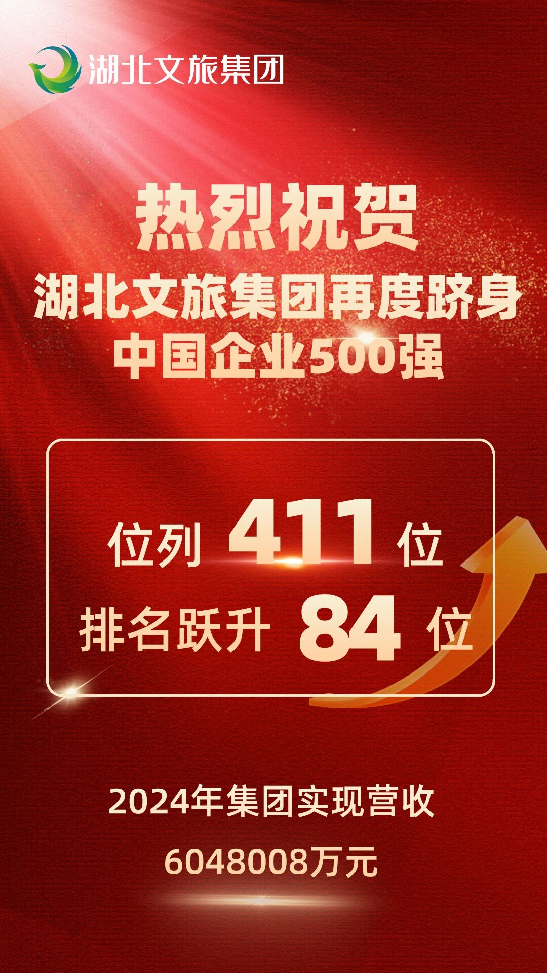 湖北文旅集團(tuán)再入圍中國(guó)企業(yè)500強(qiáng),排名躍升84個(gè)位次。9月15日,中國(guó)企業(yè)聯(lián)合會(huì)、中國(guó)企業(yè)家協(xié)會(huì)連續(xù)第24次向社會(huì)發(fā)布了“中國(guó)企業(yè)500強(qiáng)” (以下簡(jiǎn)稱“企業(yè)500強(qiáng)”)榜單。湖北文旅集團(tuán)連續(xù)第二年入圍,排名升至411位,比去年躍升了84個(gè)位次。近年來(lái),集團(tuán)年?duì)I收、經(jīng)營(yíng)性利潤(rùn)均保持20%以上高位增長(zhǎng),特別是2024年集團(tuán)投資、營(yíng)收、接待游客量三個(gè)核心指標(biāo)增長(zhǎng)100%以上,當(dāng)年接待游客量突破3100萬(wàn)人次,總資產(chǎn)達(dá)1000億元。集團(tuán)連續(xù)七年獲評(píng)全國(guó)旅游集團(tuán)20強(qiáng),連續(xù)兩年躋身“中國(guó)企業(yè)500強(qiáng)”。
